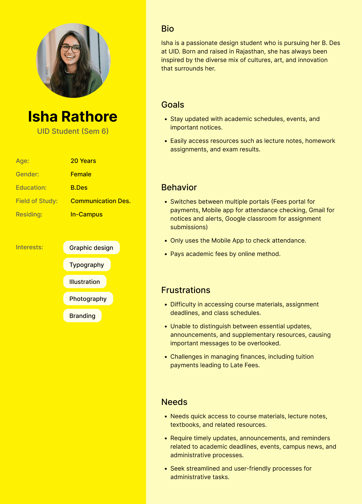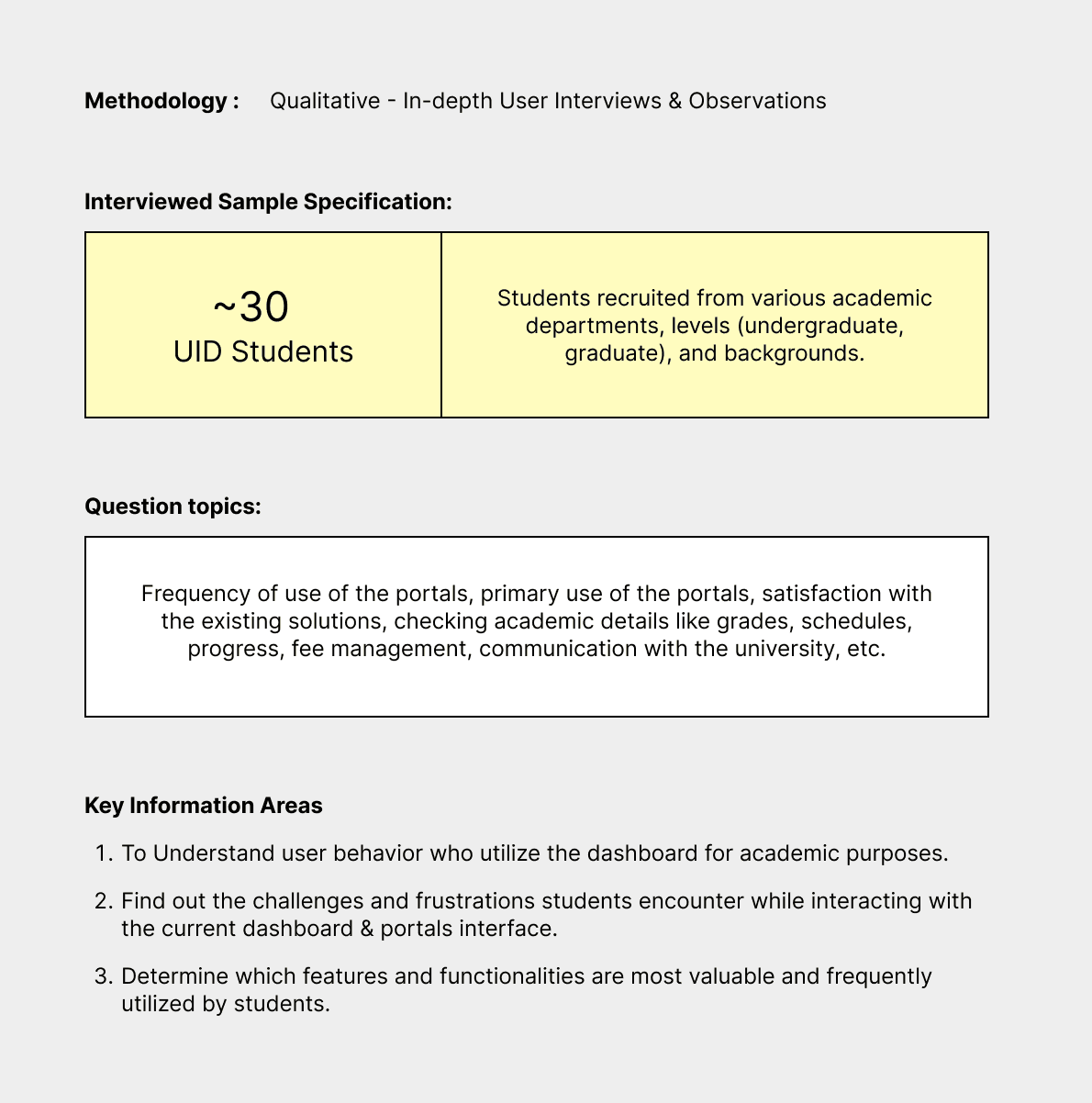 Research Objective: The primary objective of this research is to empathize with students who use the dashboard & portals in order to gain insights about their needs, preferences, and pain points. This understanding will inform the design process to create a more user-centric and effective UI/UX.