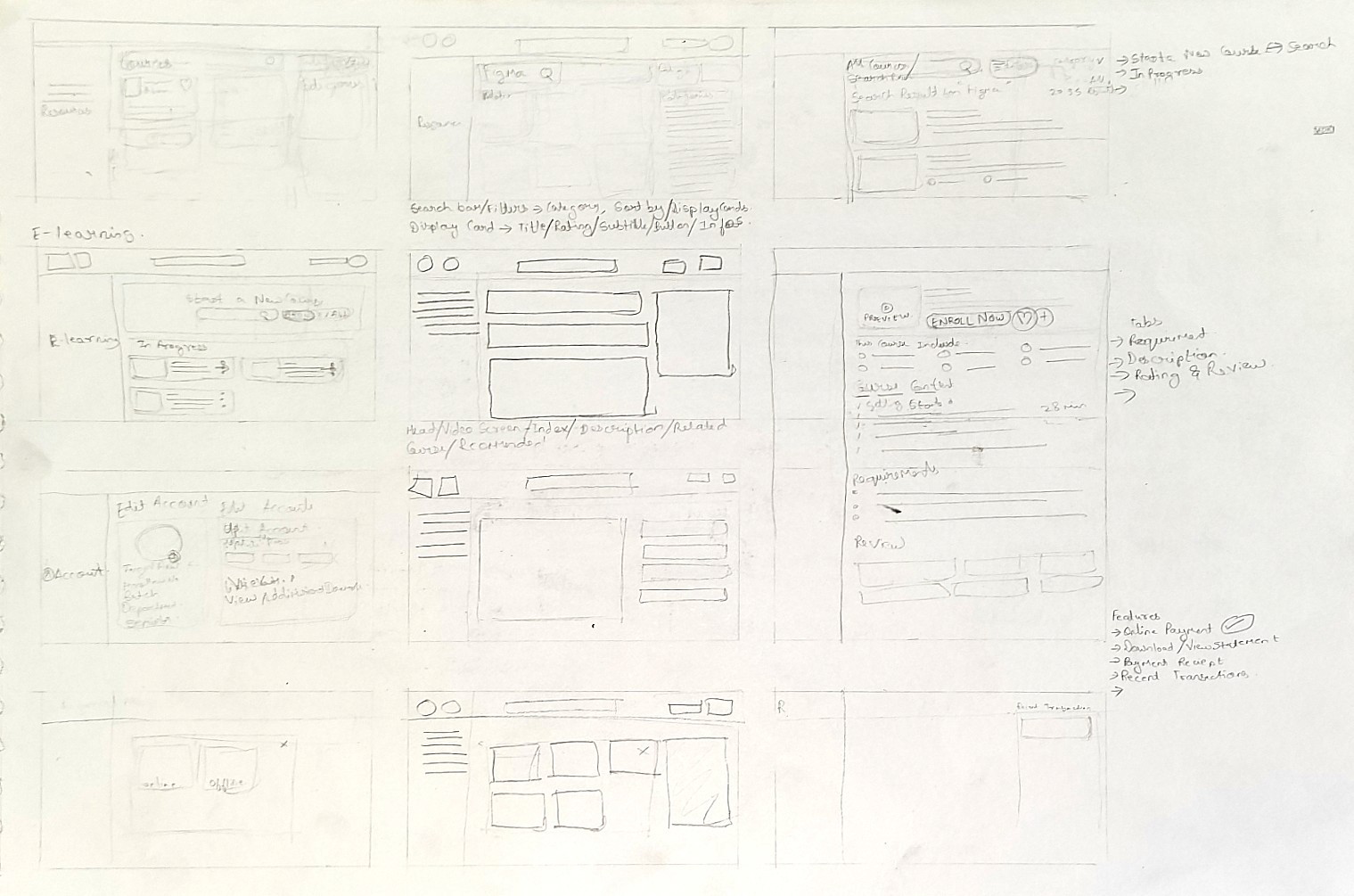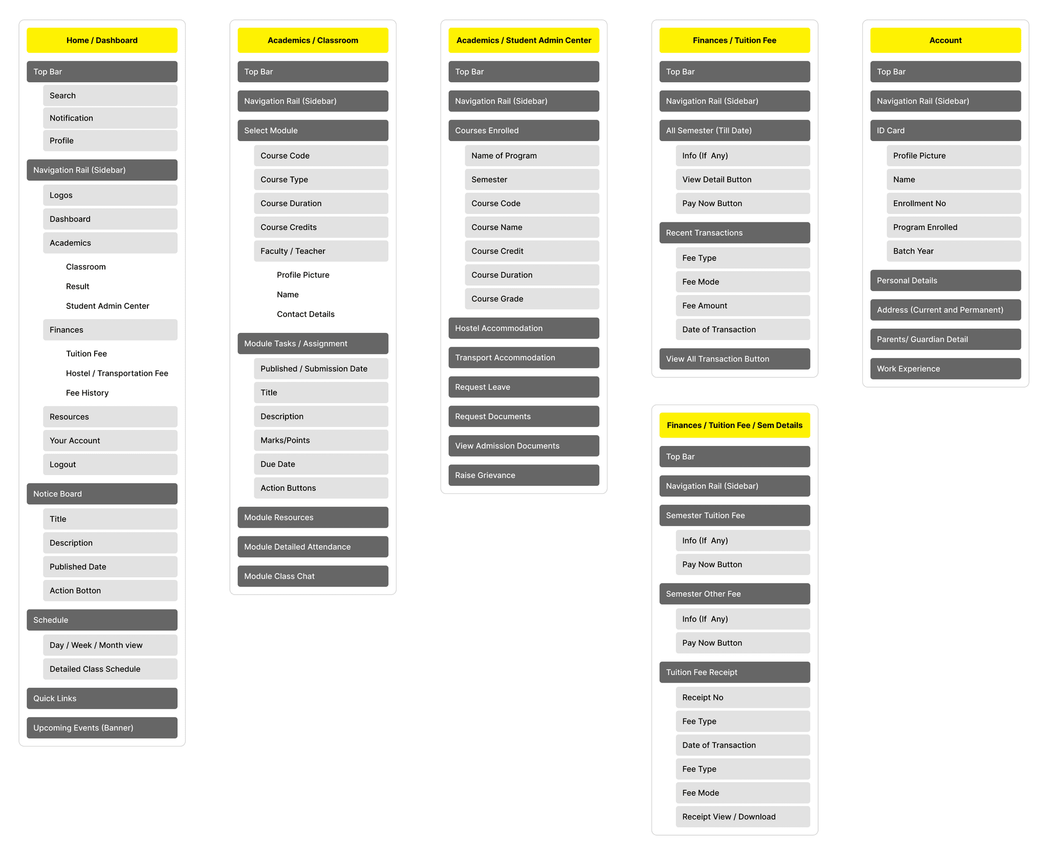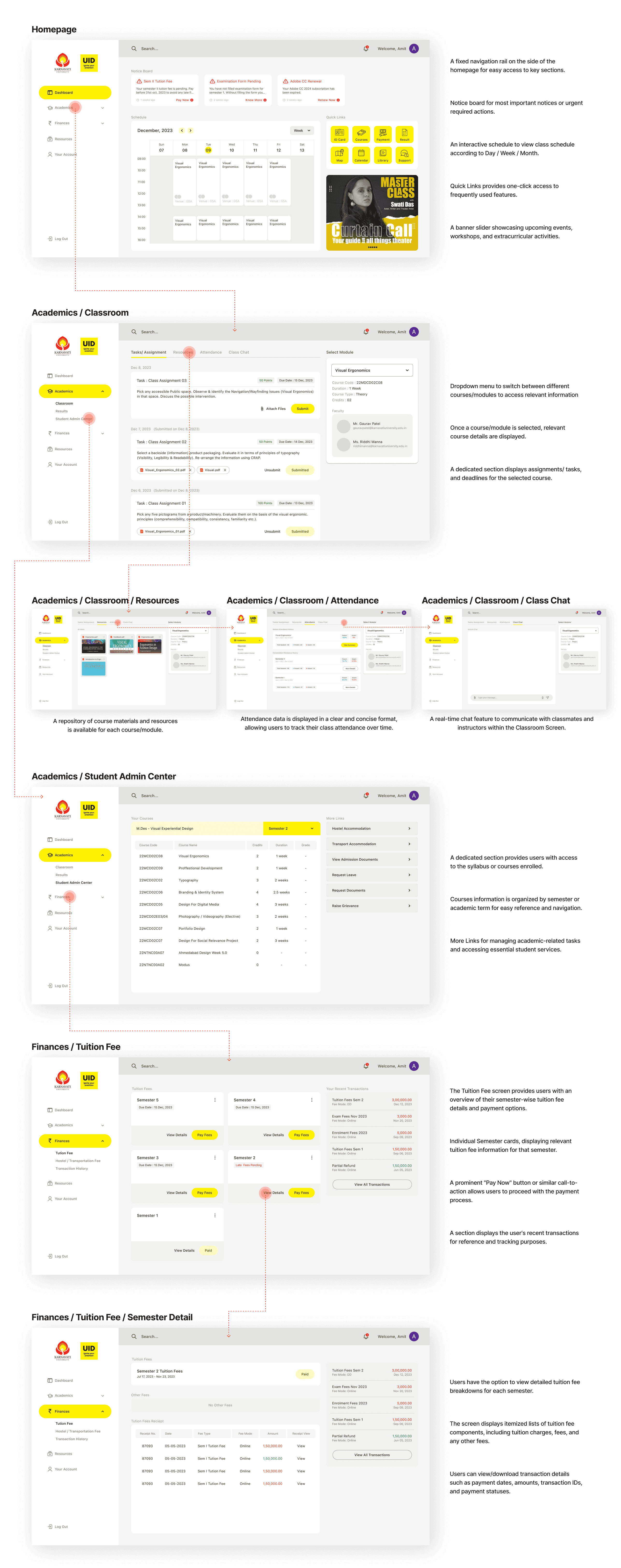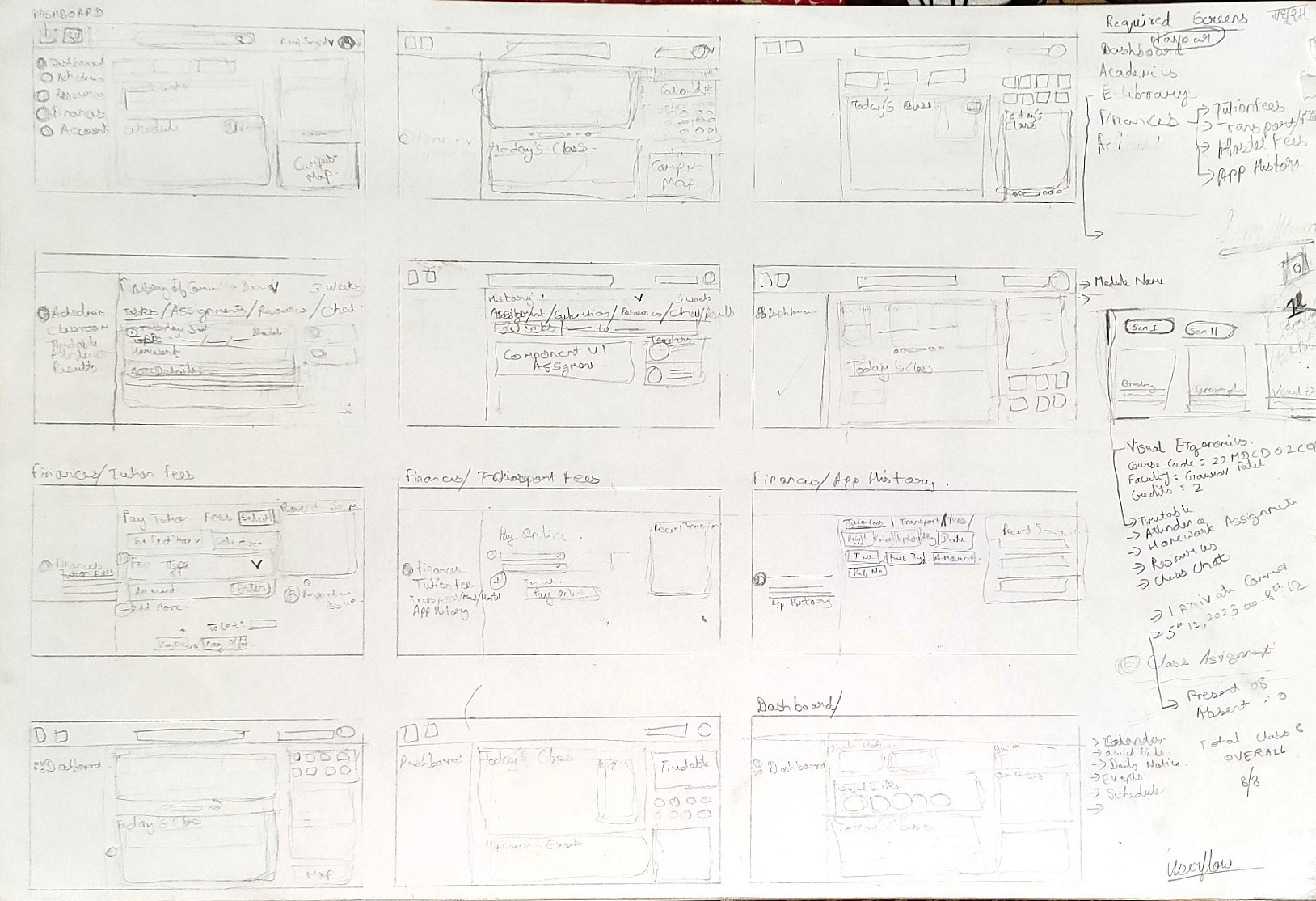 After solidifying the ideas, I took it to the next step by creating Lo-Fi wireframes for pages - Dashboard, Academics, Resources, and Finances