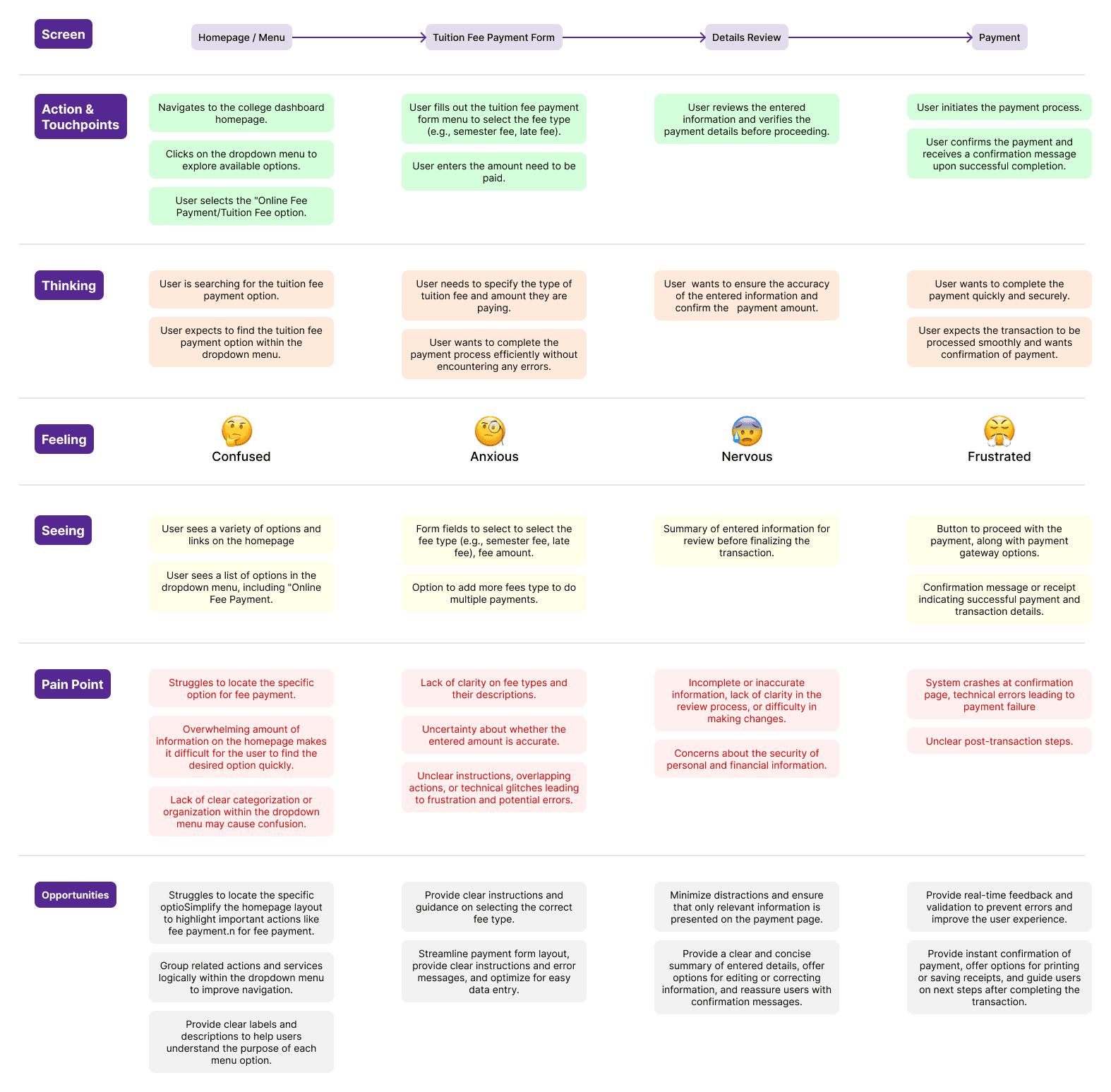 From the user journey map, I can find out how users behave when paying tuition fees on the Fee Portal and what steps they go through. I can also find opportunities based on user pain points that are useful for design improvements.