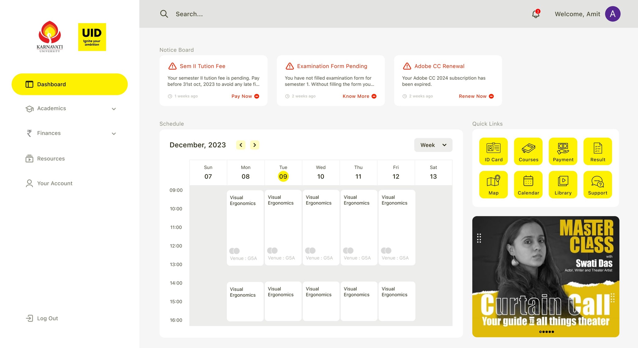 Since I began my studies, as a student in the Design program at Karnavati University, I have had problems with the student portals. They don't offer useful features, appear outdated, or match the institution's corporate identity.