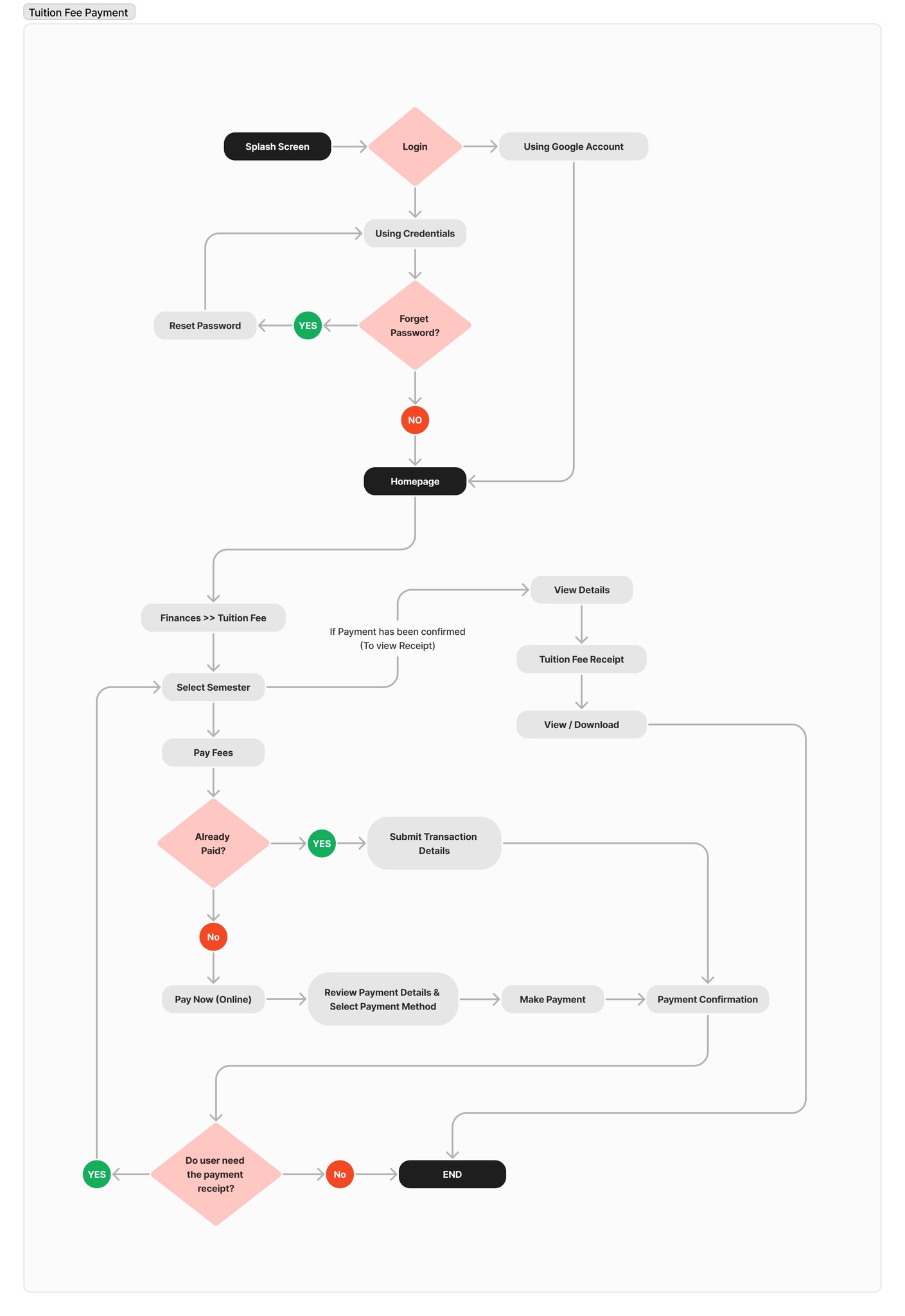 I created a User Flow to describe the steps the users will go through to pay tuition fees on the dashboard and then downloading the receipt generated.